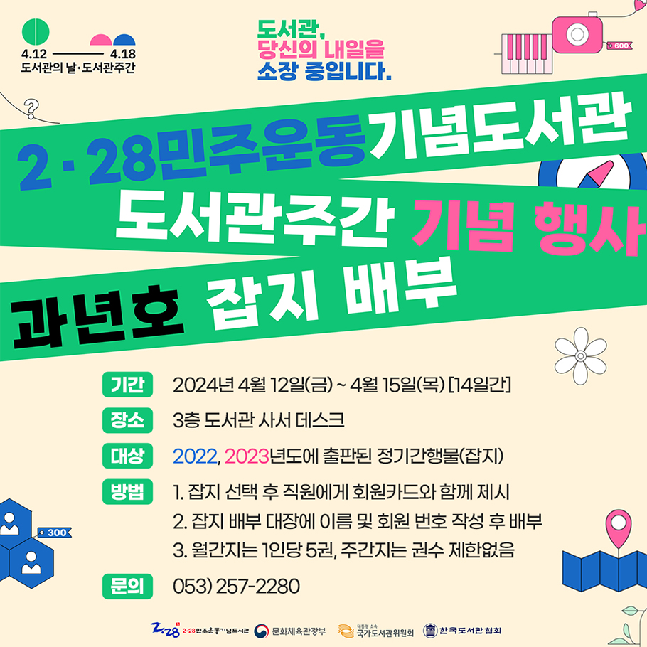2·28민주운동기념도서관은 도서관의 날 · 도서관 주간을 맞이하여 4월 12일부터 25일까지 2주간 과년호 잡지 배부 행사를 개최한다. 배부되는 잡지는 2022년, 2023년에 출간된 정기간행물을 대상으로 하며, 2·28민주운동기념회관 3층 도서관에서 받을 수 있다.