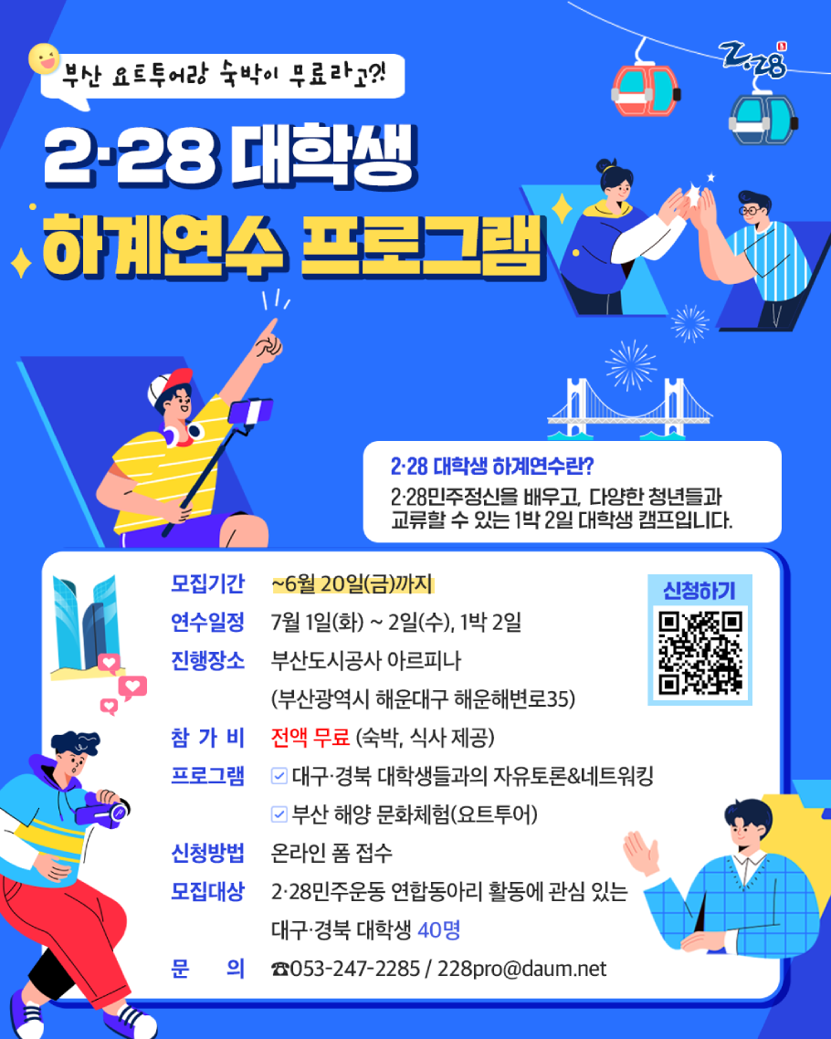 2025년 2·28 대학생 하계연수 프로그램이 7월 1일(화)부터 2일(수)까지 1박 2일간 부산도시공사 아르피나 및 동백섬 일대에서 진행된다. 이번 연수는 대구·경북 지역 대학생을 대상으로 2·28민주정신을 배우고, 다양한 청년들과 교류할 수 있도록 기획된 1박 2일 대학생 캠프다.