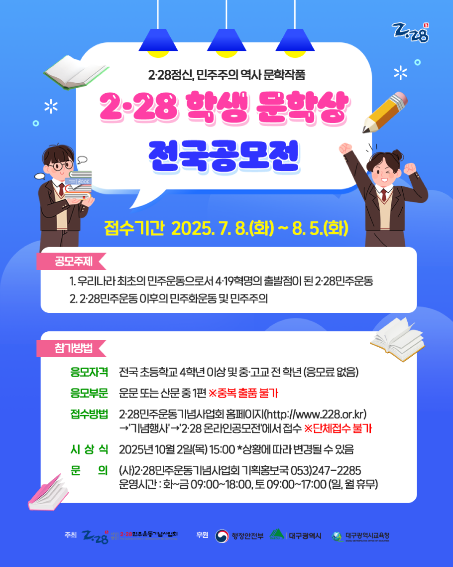 2·28민주운동기념사업회는 2025년 제25회 2·28학생 문학상 전국 공모전을 개최하며, 작품 접수는 7월 8일(화)부터 8월 5일(화)까지 진행되었다.
