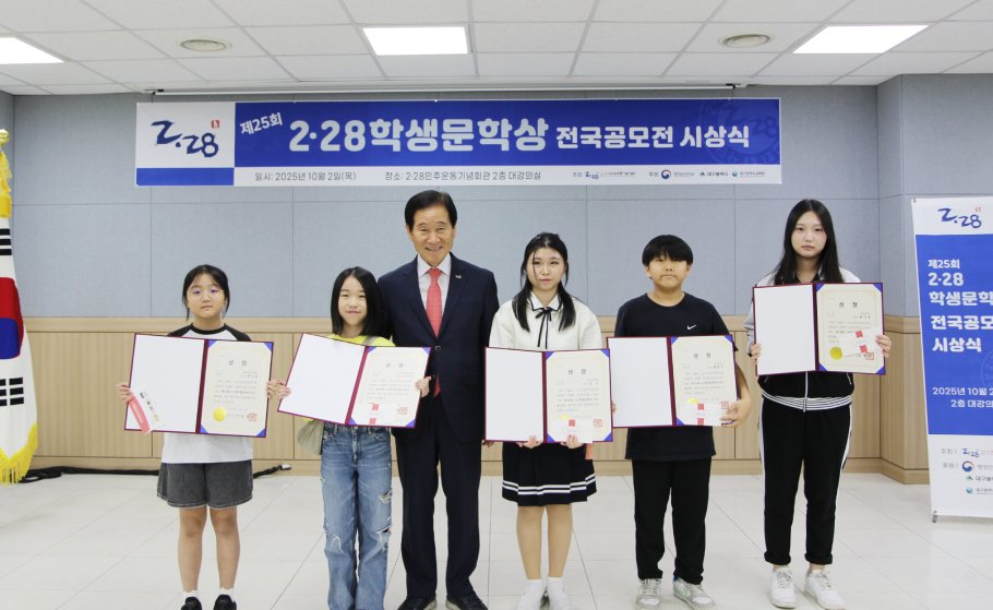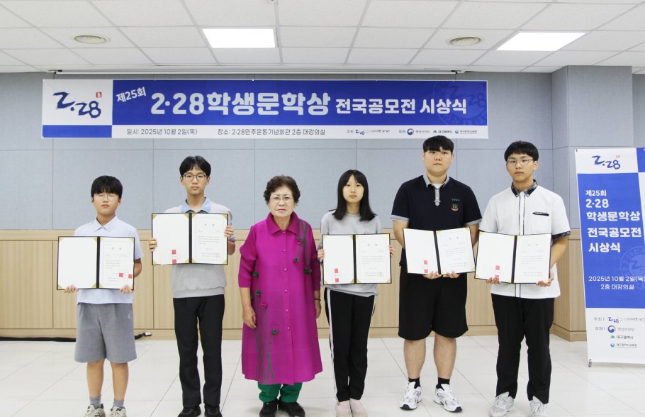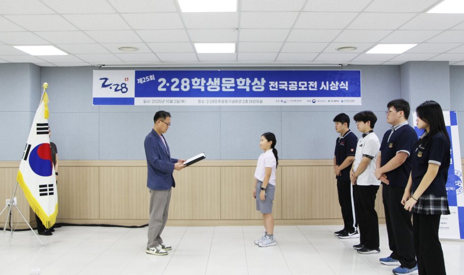 (사)2·28민주운동기념사업회는 10월 2일 2·28민주운동기념회관 4층 대회의실에서 ‘제25회 2·28학생문학상 전국 공모전’ 시상식을 개최했다. 이번 시상식은 곽대훈 2·28민주운동기념사업회장을 비롯한 임직원, 수상자, 학부모, 교사 등이 참석한 가운데 진행됐다. 앞서 (사)2·28민주운동기념사업회는 7월 8일부터 8월 5일까지 제25회 2·28학생문학상 전국공모전을 개최하고, 2·28정신과 우리나라 민주주의의 역사를 주제로 한 문학 작품을 공모했다. 이번 공모전에는 전국 145개교 1,286점이 공모됐으며, 전문 심사위원회 심사를 거쳐 대상 2점, 금상 12점, 은상 18점, 동상 30점, 입선 42점 등 104점의 수상작을 선정했다.