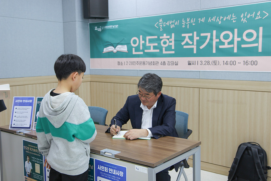 2·28민주운동기념도서관은 3월 28일 토요일 오후 2시부터 회관 2층 대강의실에서 안도현 작가와의 만남을 진행했다. 이번 행사는 안도현 시인의 열두 번째 시집 「쓸데없이 눈부신 게 세상에는 있어요」를 중심으로, 작고 빛나는 존재들이 전하는 위로와 울림을 시민들과 함께 나누기 위해 마련됐다.
