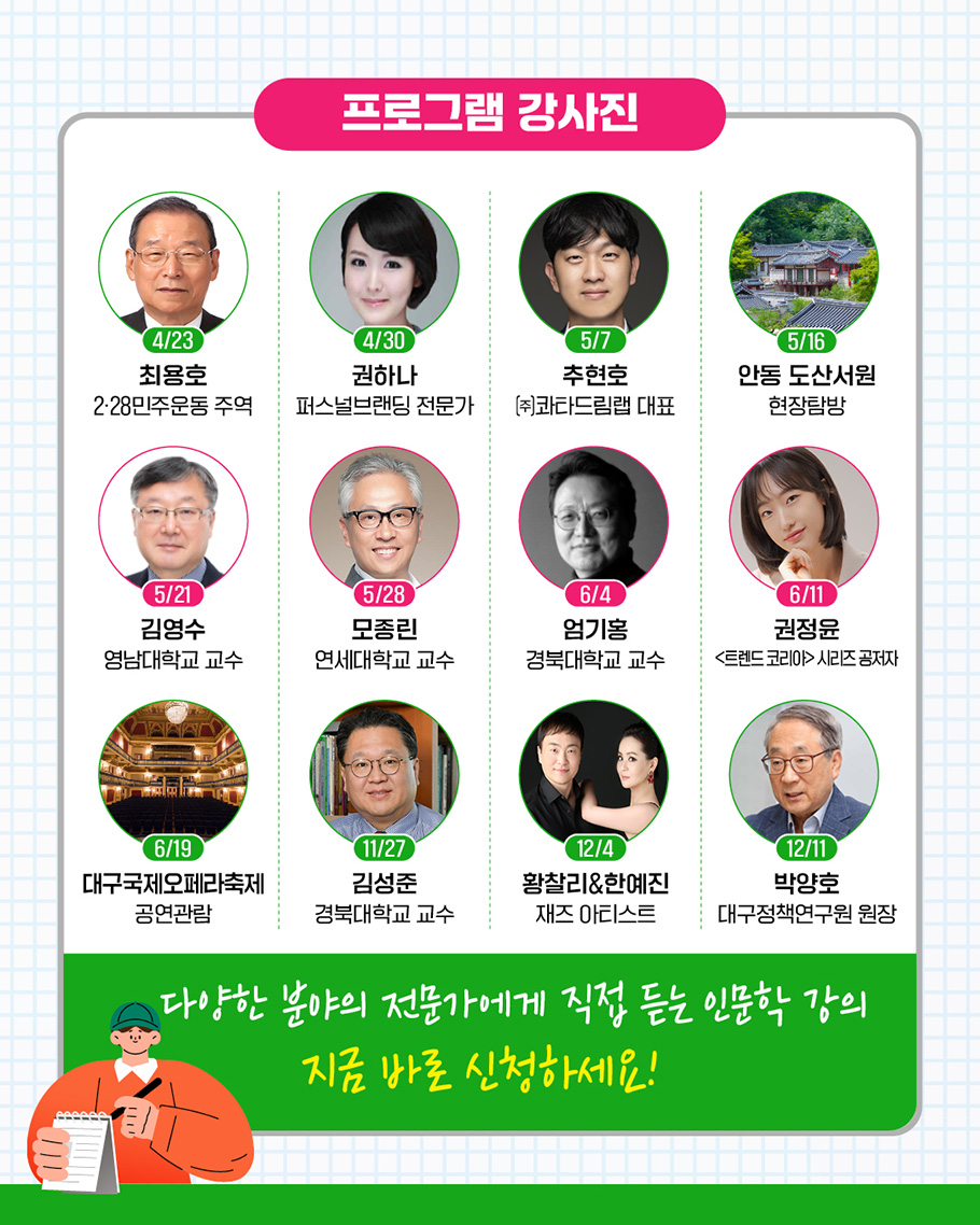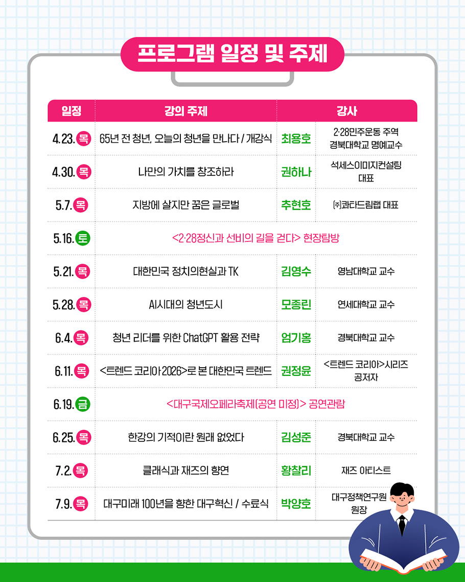 주요 강좌는 2·28민주운동 주역과의 만남을 시작으로 청년의 가치와 브랜딩, 대한민국 정치의 현실, AI 시대의 청년도시, ChatGPT 활용 전략, 대한민국 트렌드, 대구의 미래와 혁신 등 청년 세대의 관심과 시대적 흐름을 반영한 내용으로 마련됐다. 또한 안동 도산서원 현장탐방과 대구국제오페라축제 공연관람도 함께 진행될 예정이다.