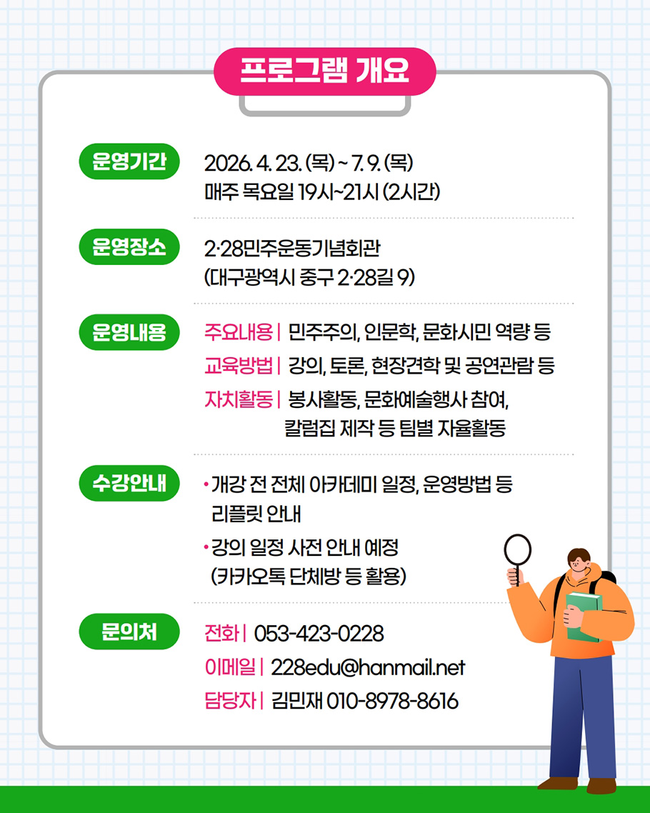 2·28민주운동기념사업회 평생교육원은 대구 청년 리더 양성 프로그램인 2·28청년아카데미 제9기 수강생을 오는 4월 17일 금요일까지 모집한다.