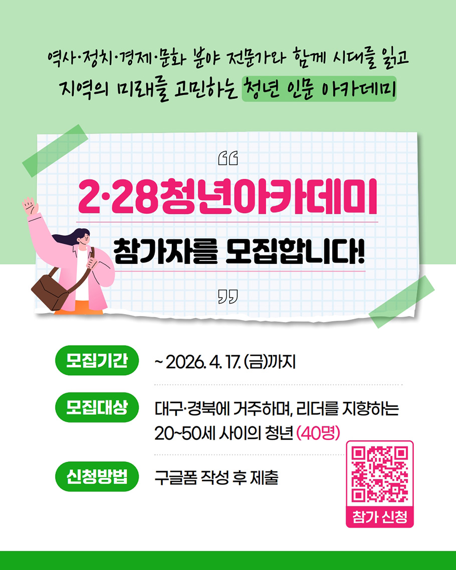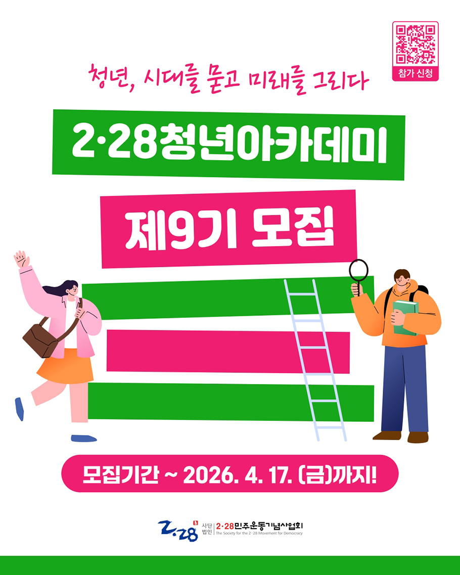 모집 대상은 대구·경북에 거주하며 리더를 지향하는 20세부터 50세 사이의 청년 40명이며 신청은 구글폼을 통해 가능하다. 자세한 사항은 2·28민주운동기념사업회로 문의하면 된다.