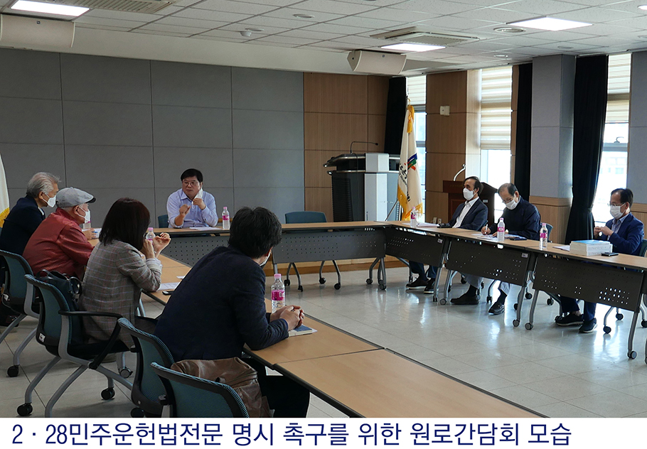 (사)2.28기념사업회는 지난 5월 20일 2·28민주운동 헌법전문 명시 촉구 성명서를 발표했다. 우동기 2.28기념사업회장 명의로 발표된 이번 성명서는 5월 18일 지난 5월 18일 전국 시·도지사협의회는 권영진 대구시장의 제의로, 21대 국회에서 헌법개정을 논의할 경우 2·28민주운동의 이념을 헌법전문에 명시해야 한다는 공동성명 발표에 따른 후속 조치이다. 성명서 발표 전 임직원 간담회에서는 지난 2018년 2.28국가기념일 지정 직후 헌법전문 수록 건의 진행 사항을 검토했다.
