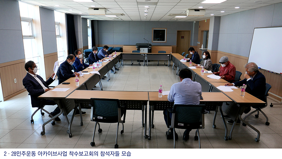 5월 27일(수) 오전 2·28민주운동기념회관 4층 대강의실에서 ‘2020년도 2·28민주운동 아카이브 사업’ 착수보고회가 있었다 2·28기념사업회 우동기 회장을 비롯해 노동일, 박민철, 여행웅, 홍종흠 연구자문위원, 백승대 2·28연구원장과 김천수, 안도헌, 최병덕, 조해정 연구위원이 참석한 이날 보고회에서는 ‘1960년 전후 대구지역 고등학생의 생활문화 자료 수집’과 ‘2·28민주운동 기존 아카이브 자료의 메타데이타 작업’등 아카이브 구축사업의 2대 과제에 대해 심도 있는 논의가 이루어졌다.