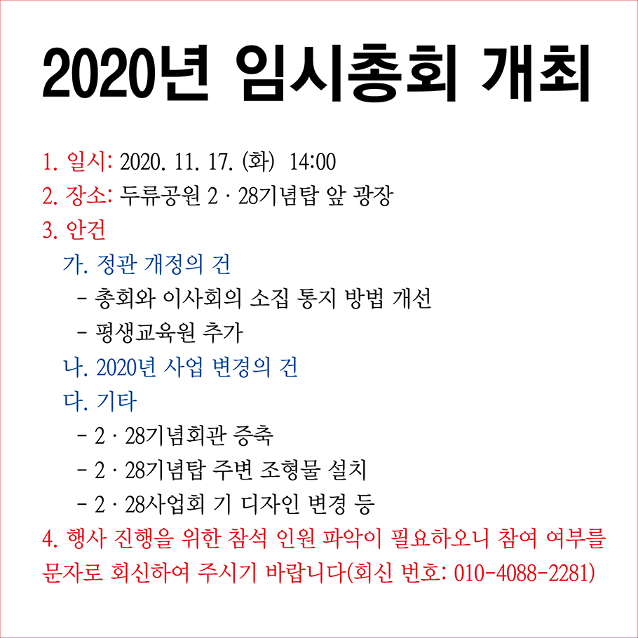 (사)2·28민주운동기념사업회 2020년 임시총회가 11월 17일(화) 오후 2시 두류공원 2·28기념탑 앞에서 개최될 예정이다. 이 번 임시총회의 일시 및 주요안건은 아래와 같다.