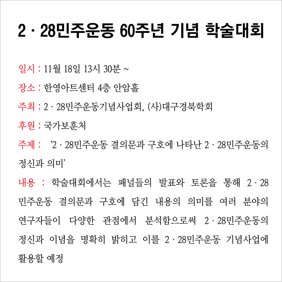 2·28민주운동기념사업회 2·28연구원(원장 : 백승대)은 11월 18일 13시 30분 부터 2·28민주운동 60주년 기념학술대회를 한영아트센터 4층 안암홀에서 개최한다. 이번 학술대회는 (사)대구경북학회(회장 : 최철영)와 공동으로 ‘2·28민주운동 결의문과 구호에 나타난 2·28민주운동의 정신과 의미’란 주제로 개최되며 국가보훈처가 후원한다. 학술대회에서는 패널들의 발표와 토론을 통해 2·28민주운동 결의문과 구호에 담긴 내용의 의미를 여러 분야의 연구자들이 다양한 관점에서 분석함으로써 2·28민주운동의 정신과 이념을 명확히 밝히고 이를 2·28민주운동 기념사업에 활용할 예정이다.