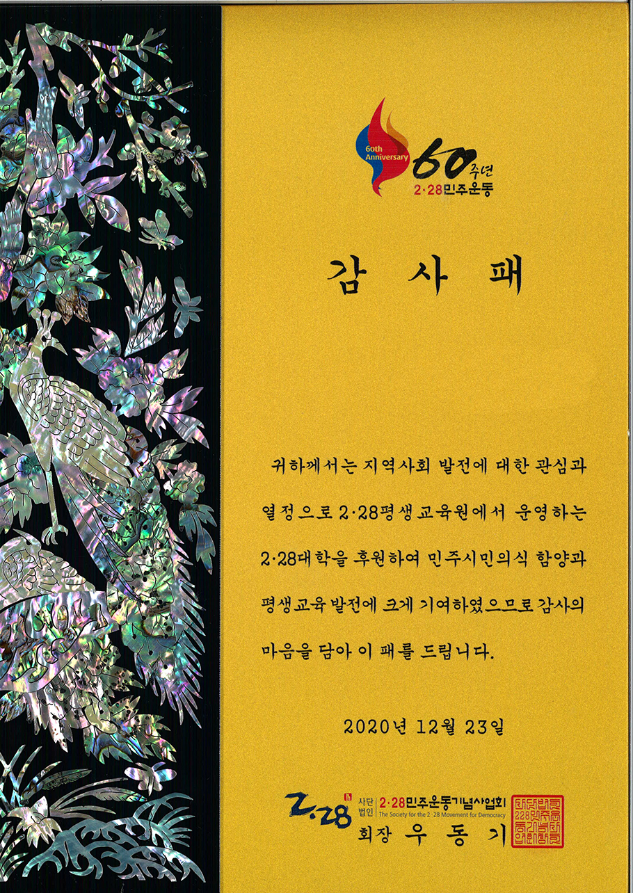 2·28평생연구원(원장 : 김기식)은 최근 커지는 코로나19 확산세로 인해 2·28대학 제3기 수료식을 비대면으로 진행한다고 밝혔다. 출석율 70% 이상을 기록한 2·28대학 제3기 수료 대상는 모두 41명이며 수료증은 수료자들에게 우편으로 개별 발송될 예정이다. 또 2·28평생교육원 교육프로그램 운영지원에 대한 감사의 뜻 전달하기 위해 ㈜맨투맨써비스(대표 : 장호용)에게는 감사패를 수여했다.