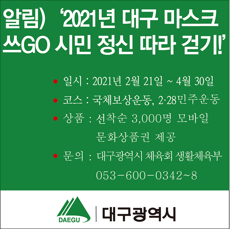 알림) ‘2021년 대구 마스크 쓰GO 시민 정신 따라 걷기!’