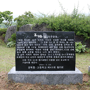 2·28민주운동 주역세대인 경북중·고 43회 동기회는 2021년 5월 14일 오전 11시 경북고 교정의 2·28기념동산에서 2·28민주운동 기념비 제막식을 가졌다. 이 기념비는 기념동산의 2·28기념탑 옆에 이미 설치되어 있는 경북중·고 42회 동기회 기념비와 나란히 자리 잡게 되었다. 이날 제막식에는 이국웅 경북중·고 43회 동기회장, 신용범 총무 및 이완식 전 2·28민주운동기념사업회 제4대 공동의장을 비롯한 경북중·고 43회 동문들과 2·28민주운동기념사업회 최용호, 박명철, 이광조 원로자문위원 및 백승대 부회장 등 50여 명이 참석하였다. 이국웅 회장은 “후배들이 기념비를 거울삼아 2·28선배들의 불의에 항거한 정신과 애국애족 정신을 계승해주기를 기대한다”고 말했다.