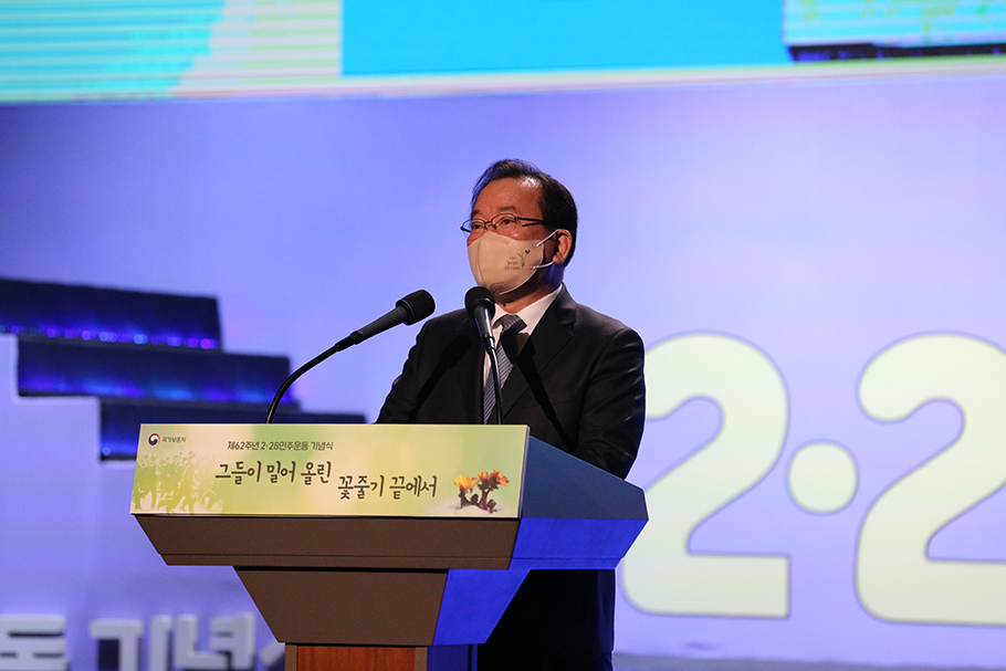28일 오전 11시 제62주년 2·28민주운동기념식이 대구문화예술회관 팔공홀에서 개최되었다. 김부겸 국무총리가 참석한 이번 기념식은 '그들이 밀어 올린 꽃줄기 끝에서'라는 주제로 진행되었다. 코로나로 인해 기념식은 50명 미만으로 참석한 가운데 진행된 62주년 기념식은 2·28이 국가기념일로 지정된 후 다섯 번째 기념식이다. 기념식에 앞서 10시 30분에는 두류공원 2·28기념탑에서 김부겸 총리가 참석한 참배식이 거행되었다. 2·28기념사업회는 기념식 직전, 김부겸 국무총리에게 감사패와 2·28민주운동60주년 기념사진집을, 송영길 민주당대표에게도 2·28 60주년 기념 사진집을 증정했다.