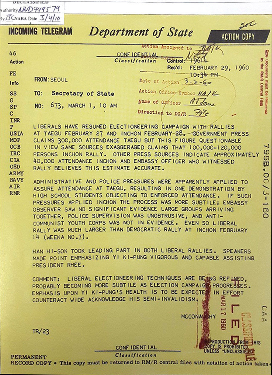 그동안 존재가 알려지지 않았던 1960년 2·28민주운동과 관련된 미국정부의 공식문서가 발견되었다. (사)2·28민주운동기념사업회는 1960년 3월 초, 당시 매카나기(McConaughy) 미국대사가 미 국무부에 보낸 전문 중 일부와 미8군 사령부가 작성한 일일정보보고서 중 일부에 2·28민주운동의 상황을 기술한 내용을 발견해 62주년 2·28민주운동기념일을 앞두고 공개했다. 2·28민주운동과 관련한 외국 정부의 공식문서가 발견된 것은 2·28민주운동 발생 62년 만에 처음이며, 미국 정부 공식문서에 2·28민주운동 당시의 상황이 기록되어 있다는 것을 확인한 것으로 매우 의미가 큰 것으로 평가된다. 이 문서는 백재호 2·28민주운동기념사업회 기획홍보국장이 발견하고, 번역과 분석은 경북대 영문학과의 김노주 교수가 맡아 「미국이 본 2·28민주운동」이란 제목의 논문발표를 앞두고 있다.