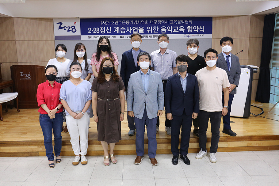 (사)2·28민주운동기념사업회(회장:박영석)와 대구광역시 교육음악협회(회장:김혜령)는 8월 23일 오후 2·28민주운동기념회관에서 「2‧28정신 계승사업을 위한 음악교육 협약」을 체결했다. 이번 협약식에는 박영석 2·28기념사업회장을 비롯한 2·28기념사업회 임직원과 대구광역시 교육음악협회 김혜령 회장과 임원단이 참석했다. 양 기관은 앞으로 2·28찬가(김정길 작사, 임우상 작곡, 2000년 제정)와 2·28행진곡(김장수 작사, 백남영 작곡, 1961년 작)을 대구시 중·고등학교 음악시간에 교육해서 음악을 통해 2·28민주운동의 역사를 학생들에게 교육하는 사업에 상호협력하기로 협약했다. 박영석 2·28기념사업회 회장은 ‘2·28찬가의 학교 음악교육을 위해 2021년 대구시립교향악단(지휘:줄리안 코바체프)과 대구시립합창단(지휘:박지운)과 협력해 녹음을 마쳤고 배경영상을 제작했다. 3.1절 노래나 광복절 노래를 학교에서 배우듯 음악시간에 2·28찬가의 교육을 통해 2·28의 역사를 배우는 계기가 되었으면 좋겠다’고 말했다