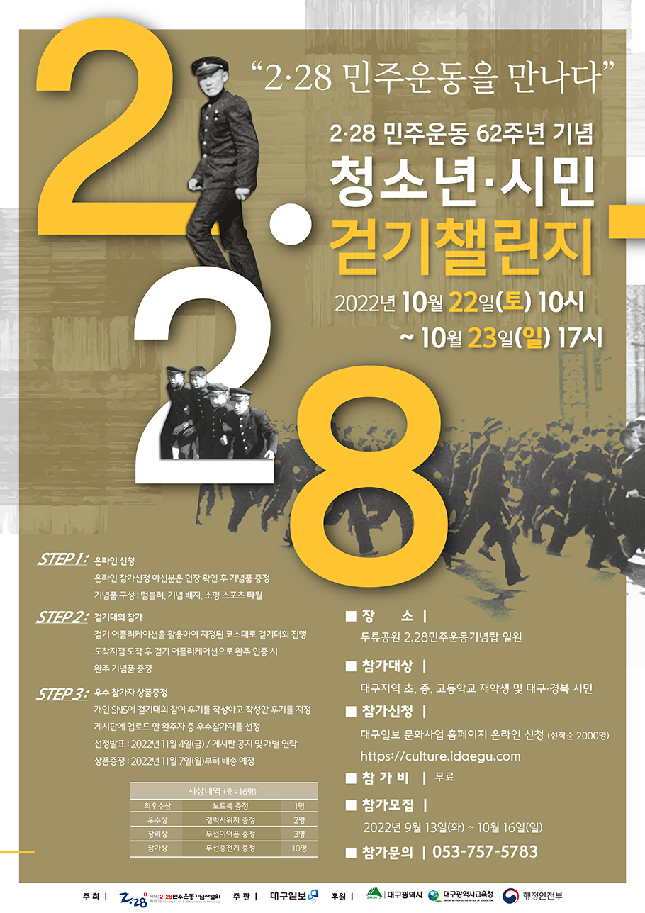2·28민주운동 기념사업회는 10월 22(토)~23(일) 이틀간 대구두류공원에서 2·28민주운동 62주년기념 청년.시민 걷기챌린지 행사를 펼친다. 개막식은 10월 22일 오전 10시 2·28기념탑 앞에서 열린다. 이날 행사는 두류공원내 걷기로 이뤄지며 참가자에 대한 푸짐한 선물도 마련해 놓고 있다. 걷기챌린지 신청은 10월 16일까지. (대구일보 문화사업부 홈페이지 온라인 신청, http://culture.idaegu.com 문의 : 053-757-5783)