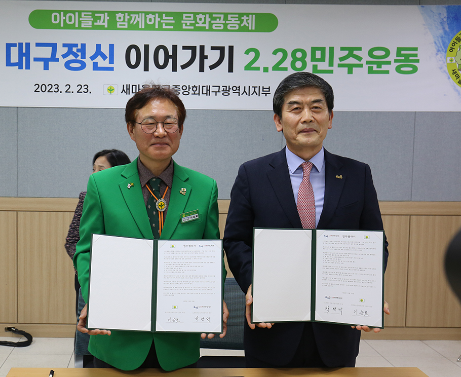 2.28기념사업회는 새마을문고 대구시지부(회장 이승로 수성고량주 대표)와 2월 23일 2·28민주운동기념관에서 '나라사랑 대구정신 이어가기 2·28민주운동' 업무협약을 체결했다. 이번 협약식에는 8개 구군 회장단, 문고 지도자와 2·28 SNS홍보단 등 100여 명이 참석했다.