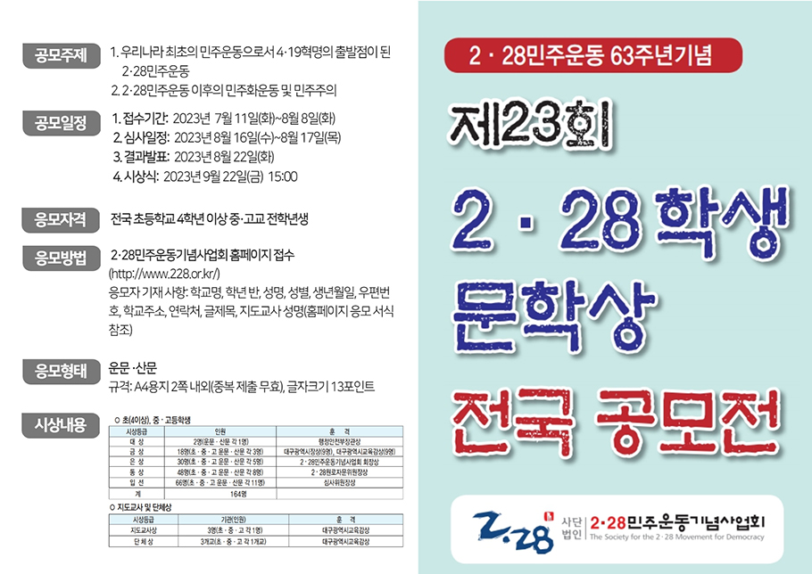 (사)2·28민주운동기념사업회는 2023년 제23회 2.28학생문학상 전국 공모전을 개최한다고 밝혔다. 이번 공모전의 주제는 ‘우리나라 최초의 민주운동으로서 4·19혁명의 출발점이 된 2·28민주운동’과 ‘2·28민주운동 이후의 민주화운동 및 민주주의’ 두 가지다. 참가자격은 전국 초등학교 4학년부터 고등학교 3학년까지의 학생으로 산문과 운문 중 선택하여 한 편을 응모할 수 있다. 행정안전부와 대구광역시, 대구광역시교육청의 후원으로 개최되는 이번 공모전의 대상은 행정안전부 장관상으로 운문과 산문 각1편 씩 수여되며, 금상에는 대구광역시장상과 대구광역시교육감상이 각각 수여될 예정이다. 또 학교에는 단체상과 지도교사상이 시상될 예정이다. 이번 공모전의 일정은 아래와 같다.