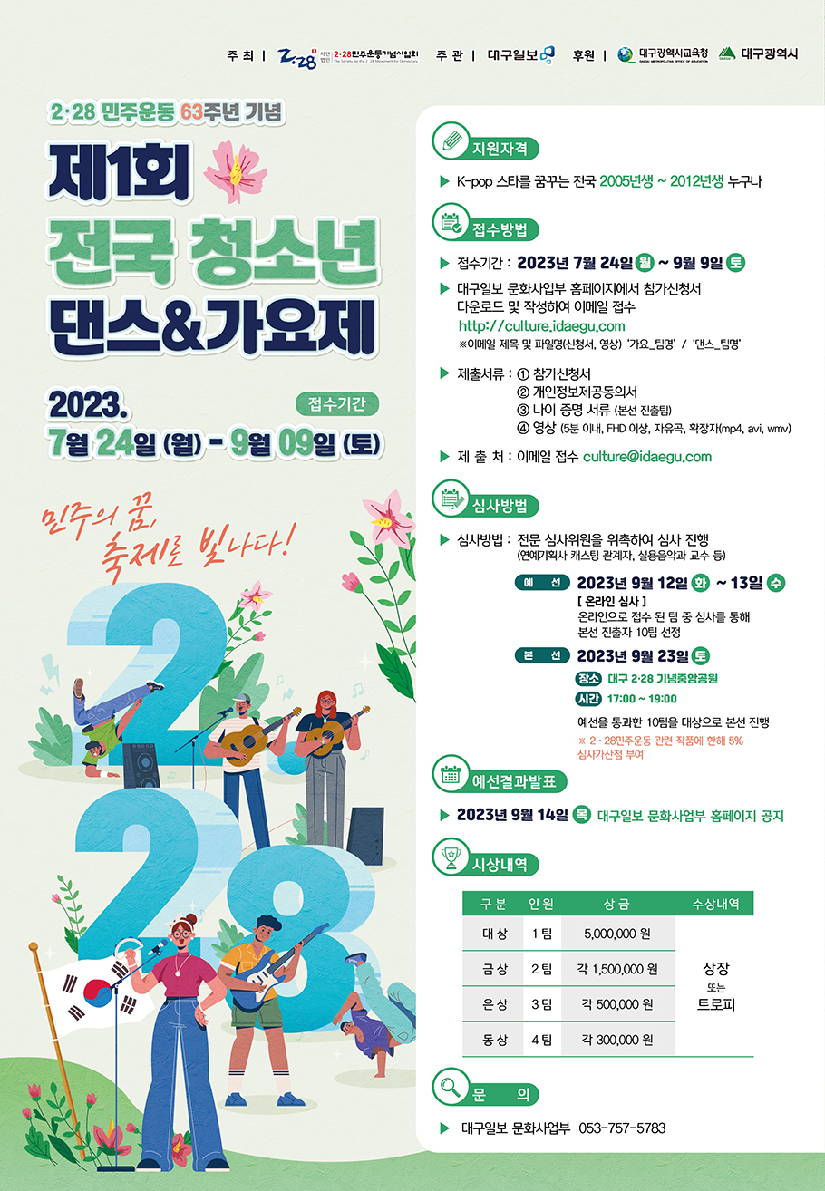 (사)2·28민주운동기념사업회는 9월 23일(토) “민주의 꿈, 축제로 빛나다!”를 주제로 「2·28민주운동 63주년 기념 제1회 전국 청소년 댄스&가요제」를 개최한다. 예선은 9월 12일과 13일에 영상 심사로 진행되며, 본선은 9월 23일 대구 2·28기념중앙공원에서 열릴 예정이다.