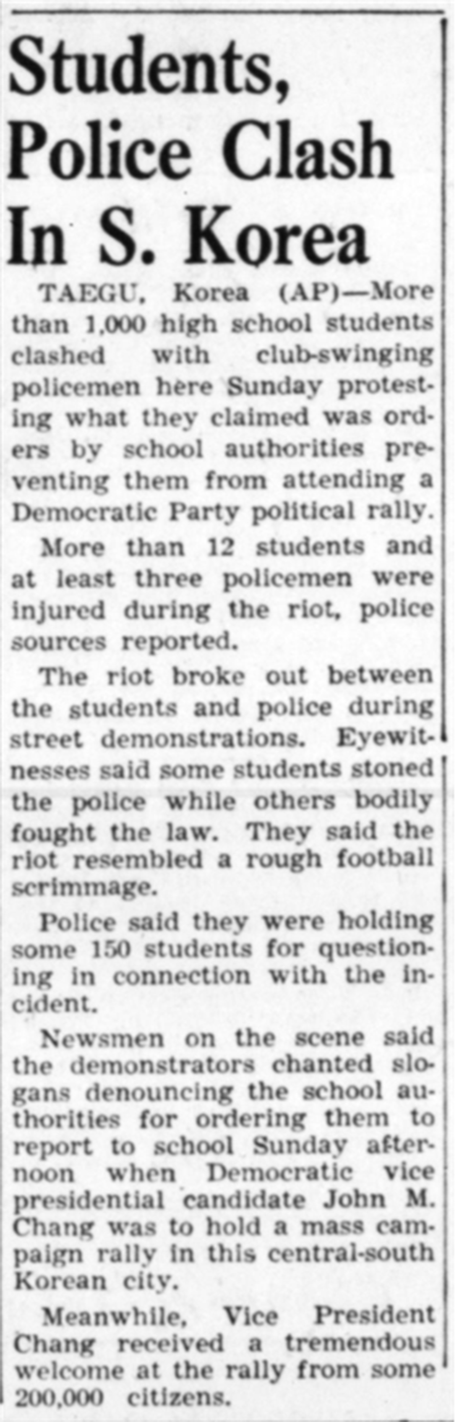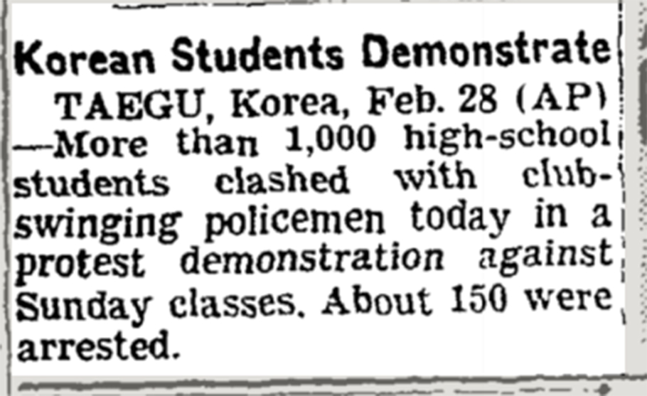 AP통신은 대구발 첫 기사에서 “천명 이상의 고등학생들이 교육 당국의 일요일 등교 조치에 항의해 시위에 나서 곤봉을 휘두르는 경찰과 충돌했다”고 보도했다. 또, “이날 시위로 최소 12명의 학생과 경찰관 3명이 부상을 입었고 150명 학생이 경찰에 구금됐다”고 보도했다. 아울러 AP통신은 이날 시위 상황을 자세히 보도하면서 “28일 오후 대구 수성천변에서 열린 민주당 장면 부통령 후보 선거유세에는 약 20만 명의 대구시민들이 몰렸고 후보는 시민들로부터 열렬하게 환영받았다”라고도 덧붙였다.