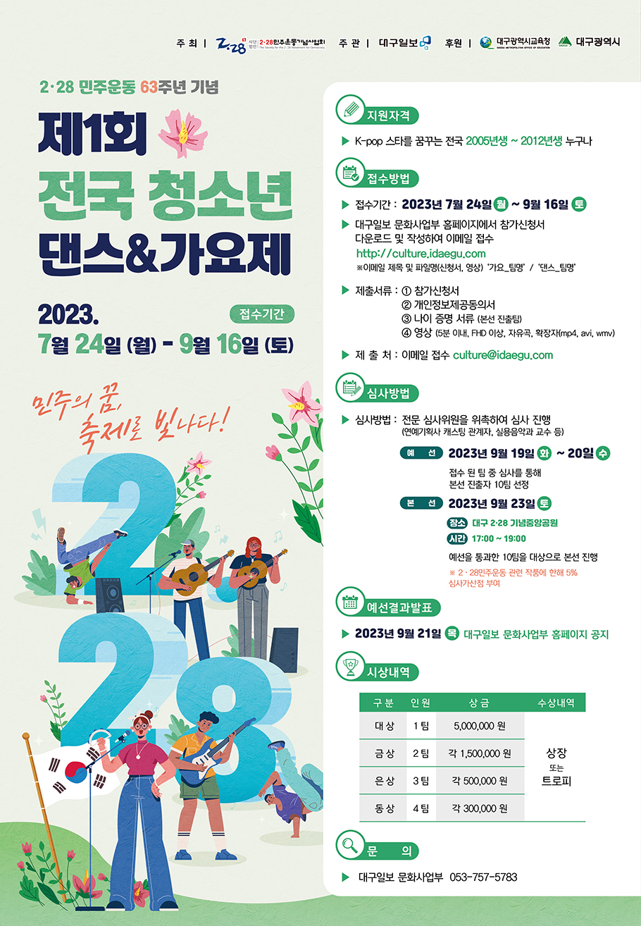 2·28민주운동 63주년 기념 「제1회 전국 청소년 댄스&가요제」가 전국적인 관심 속에 9월 23일 오후 5시부터 2.28기념중앙공원에서 열린다. 이번 대회는 2·28민주운동의 청년 정신을 잇고, 활력 넘치는 청소년들의 꿈을 지원하고자 창립된 대회로, 예선은 9월 19일과 20일에 영상 심사로 진행된다. 예선을 거친 10개팀은 9월 23일 2·28기념중앙공원 특설무대에서 우승을 가리게 된다. 대상은 1팀으로 500만원, 금상은 2팀 각 150만원, 은상 3팀 각 50만원, 동상 4팀 각 30만원의 상금도 받게 된다.