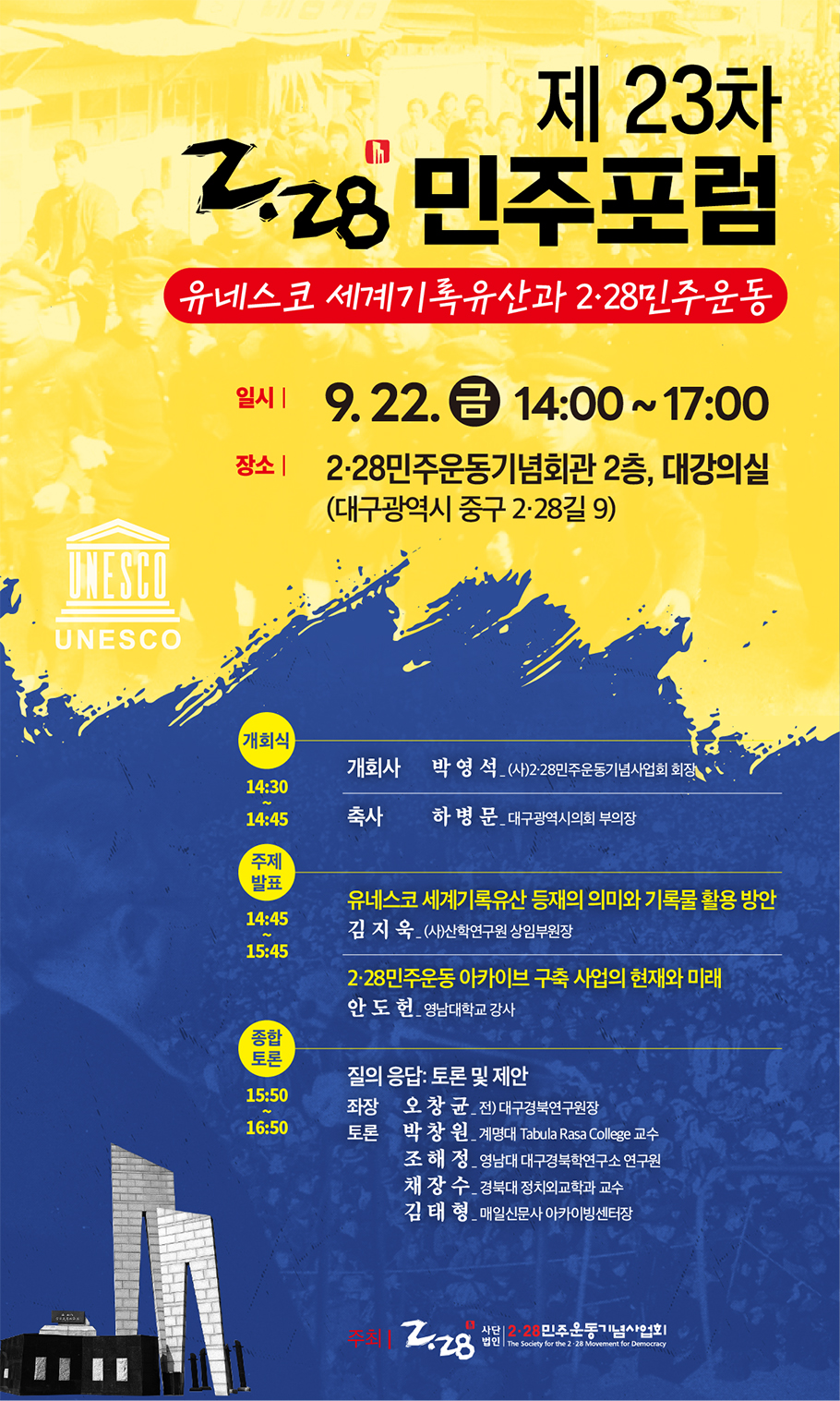 ‘유네스코 세계기록유산과 2·28민주운동’을 주제로 제23차 2.28 민주포럼이 9월 22일(금) 오후 2시 2·28민주운동기념회관 2층 대강당에서 열린다.