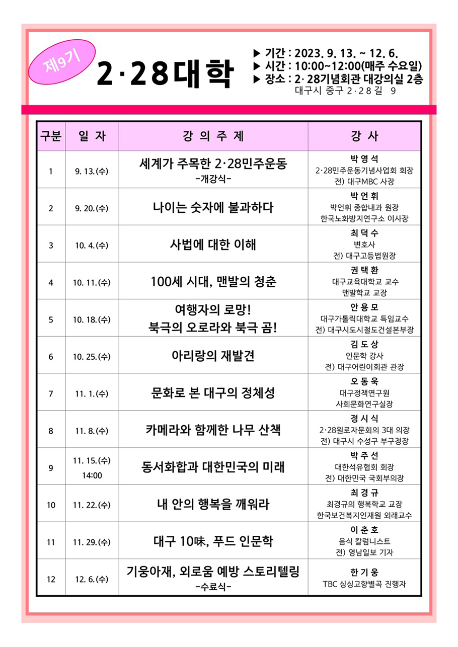 2·28대학 제9기는 9월 13일(수) 개강식을 열고, 박영석 2·28기념사업회장의 “세계가 주목한 2·28민주운동” 개강 특강을 진행한다. 이어 박언휘 한국노화방지연구소 이사장의 “나이는 숫자에 불과하다”, 최덕수 전 대구고등법원장의 “사법에 대한 이해”, 정시식 2·28원로자문회의 3대 의장의 “카메라와 함께한 나무 산책”, 이춘호 음식 칼럼리스트의 “대구 10味, 푸드 인문학” 등 다양한 교양을 쌓을 수 있는 강의가 12월까지 이어질 예정이다. (문의 : 053-423-0228, 김민재 교육팀장)