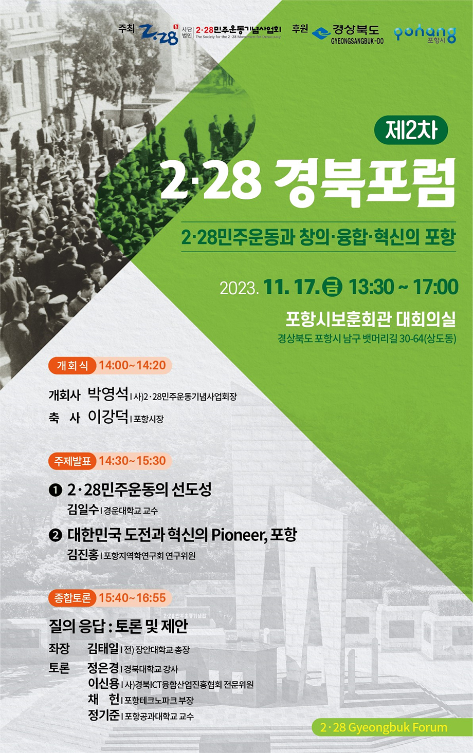 2‧28민주운동기념사업회는 11월 17일(금) 13시 30분부터 포항시보훈회관 대회의실에서 "2·28민주운동과 창의·융합·혁신의 포항"이라는 주제로 제2차 「2·28경북포럼」을 개최했다. 「2·28경북포럼」은 우리나라 최초의 민주화 운동인 2·28민주운동의 정신과 이념을 발전적으로 계승하고 경북도민의 민주시민의식을 함양하고자 경북도내에서 개최되는 정례 학술포럼이다. 이번 제2차 「2·28경북포럼」은 경상북도와 포항시의 후원으로 포항에서 개최되었다.