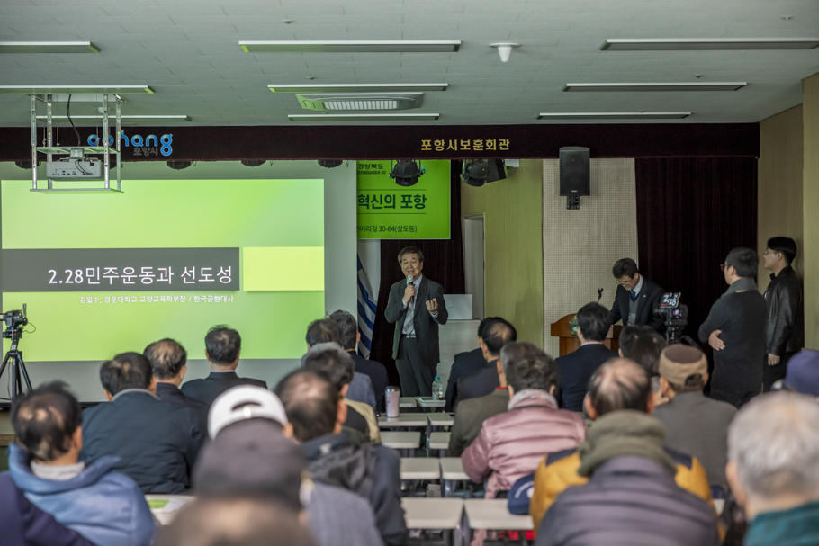 첫 번째 발표자인 경운대 김일수 교수는 "2·28민주운동의 선도성"이라는 주제를 통해 2·28민주운동의 핵심적 가치의 하나가 선도성이었다고 하면서 우리나라의 민주화와 산업화 과정에 대구·경북이 선두에 선 것은 바로 그 정신을 계승하고 있기 때문이라 하였다. 두 번째 발표자인 포항지역학연구회 김진홍 연구위원은 "대한민국 도전과 혁신의 Pioneer, 포항"이라는 주제를 통해 포항이 근대 이후 우리나라가 직면한 문제를 선두에서 해결한 도전과 혁신의 ‘파이오니’였다는 점을 강조했다.