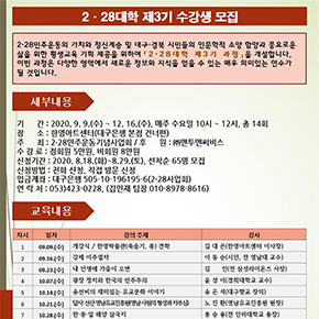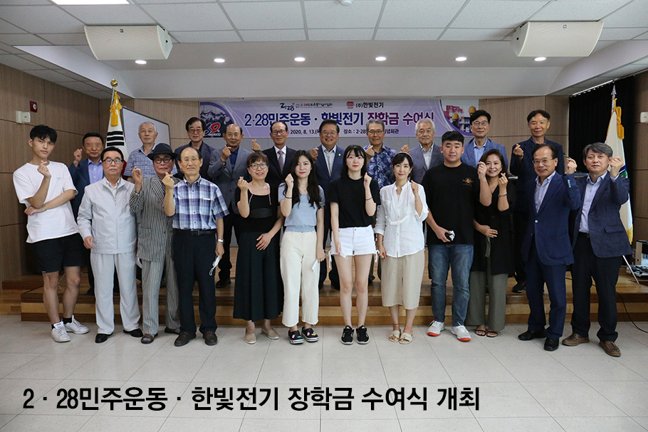 (사)2·28민주운동기념사업회는 2020년 8월 13일 2·28민주운동기념회관에서 ‘2·28민주운동·한빛전기 장학금’ 수여식을 가졌다. 2·28민주운동·한빛전기 장학금은 2·28민주운동 유공자의 후손들 중 고등학교와 대학교에 재학 중인 학생들을 대상으로 지원하는 장학금이다. ㈜한빛전기는 사회복지공동모금회를 통해 2·28민주운동기념사업회에 2020년부터 매년 일천만 원씩 3년 동안 3천만 원의 장학금을 기탁하기로 했으며 2·28기념사업회는 자격요건을 갖춘 신청자가 예상보다 많아 자체예산 800만 원을 추가로 투입하고 장학금 수혜자를 늘렸다. 금년에는 경북대사대부고 이상희군 등 고등학생 2명과 한국외국어대학 조동현군을 비롯한 대학생 8명 등 모두 10명이 장학생으로 선발되었다. 수여식에는 우동기 2·28기념사업회 회장과 ㈜한빛전기 이덕록 회장, 장학금 수여대상 학생과 2·28민주운동 유공자들 등 20여 명이 참석했다.