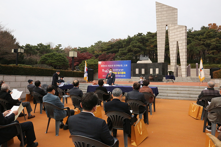 2·28기념사업회의 2020년 임시총회가 11월 17일 오후 2시 두류공원 2·28기념탑 앞 야외에서 개최되었다. 국민의례 후 우동기 2·28기념사업회장과 이원순 2·28원로자문위원회 의장의 기념탑 헌화로 시작한 이 날 임시총회에서는 2·28민주운동유공자 현창사업으로 선정된 1,671명의 2·28유공자를 대표해 박명철 원로자문위원을 비롯한 13명의 2·28유공자가 유공패를 전달받았다. 임시총회에서는 평생교육원 규정을 정관에 명시하는 안과 코로나로 인한 2020년 예산변경 안을 심의하여 원안대로 통과시켰다.