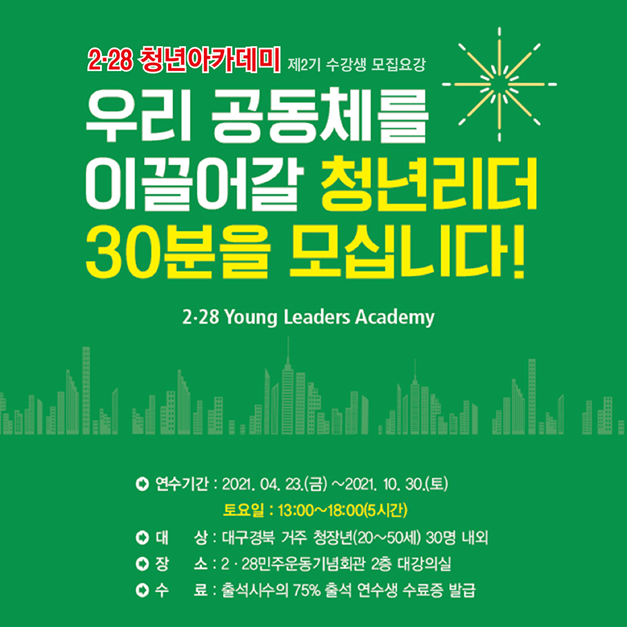 2·28평생교육원(원장 : 김기식)에서는 2·28청년아카데미 2기 수강생을 모집한다. 2·28청년아카데미는 공익적 가치를 추구하며 미래사회를 이끌어갈 민주적 리더를 육성하기 위해 지난해 부터 2·28기념사업회의 역점사업으로 진행하고 있다. 국내 최고의 강사진으로 구성된 2·28청년아카데미의 강사진과 함께 헌법, 정치, 경제, 정의, NGO, 환경, 국가론, 공익적 가치, 협상론, 빅데이터, 위기관리, 미래사회 등의 분야를 6개월 간 150시간의 강의로 진행할 예정이다. 교육은 강의(Interactive Lecture), 토론(Debate), 현장 견학 및 참여, 사례연구(Case Study), 워크숍, 프로젝트 등으로 다양한 형태로 진행된다. 출석 시수의 75% 출석한 연수생 수료증 발급되며 장학금 50만 원 지급될 예정이다.