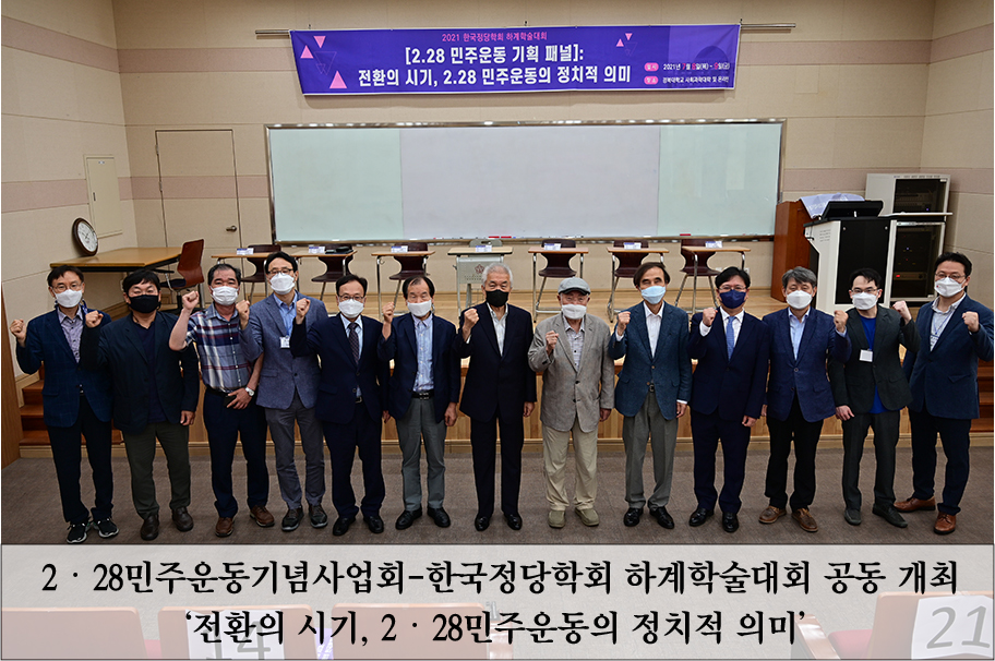 2‧28민주운동기념사업회와 한국정당학회(회장 조진만,덕성여대)는 7월 8일과 9일 경북대학교 사회과학대학에서 ‘뉴노멀 시대, 전환의 한국정치’를 주제로 한국정당학회 하계학술대회를 공동으로 개최했다. 8일 학술대회에서는 ‘전환의 시기, 2‧28민주운동의 정치적 의미’라는 특별기회으로 2‧28민주운동이 코로나 팬데믹으로 촉발된 대전환의 시기에 어떤 정치적 의미를 가질 수 있는지를 논의했다. 이날 특별기획의 발표는 서울대 아시아연구소 김용호 교수와 경북대 평화문제연구소 정재요 교수가 맡았다. 김용호 교수는 ‘공화주의 시각에서 2‧28민주운동을 재조명한다’를, 정재요 교수는 ‘2‧28정신과 전태일 정신의 현대적 재조명 : 쉴 권리를 중심으로’라는 주제를 각각 발표하고, 장우영 대구가톨릭대 교수, 엄기홍 경북대 교수, 안도헌 영남대 박사가 토론에 참여했다. 또한 2‧28민주운동에 직접 참여한 홍종흠, 여행웅, 최용호, 박명철, 이광조 2·28원로자문위원과 노동일 전 2·28기념사업회장 등이 참석하여 자리를 빛냈다.