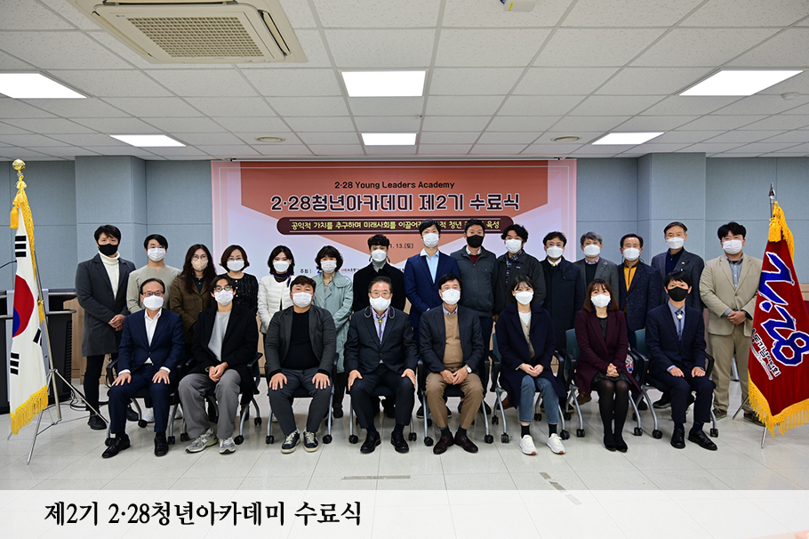 11월 13일 2·28민주운동기념회관 2층 대강의실에서 제2기 2·28청년아카데미 수료식이 개최되었다. 이날 수료식에는 우동기 2·28기념사업회장을 비롯한 2·28기념사업회 임직원과 수료생 등 28명이 참석했다. 앞서 10월 30일에는 이승한 전 홈플러스 사장의 ‘미래사회의 리더십’이란 주제의 강의가 있었다. 제2기 2·28청년아카데미 수료식 수상자는 아래와 같다. ▶모범상 : 김광민, 윤은석, 장윤영, 조경진 ▶공로상 : 회장 윤은석, 부회장 추현호, 부회장 박상희 ▶조별 프로젝트 수상팀 - 최우수상 : D조(경북도내 소상공인 디지털 지원정책 마련) - 우수상 : E조(K2종전부지 활용을 통한 미래형 청년 혁신 클러스터 구상) - 장려상 : C조(가슴 뛰는 ‘신중년-채움’ 프로젝트) - 장려상 : A조(대구경북의 사활을 건 지역대학 살리기) - 장려상 : B조(대구관광 활성화 방안)
