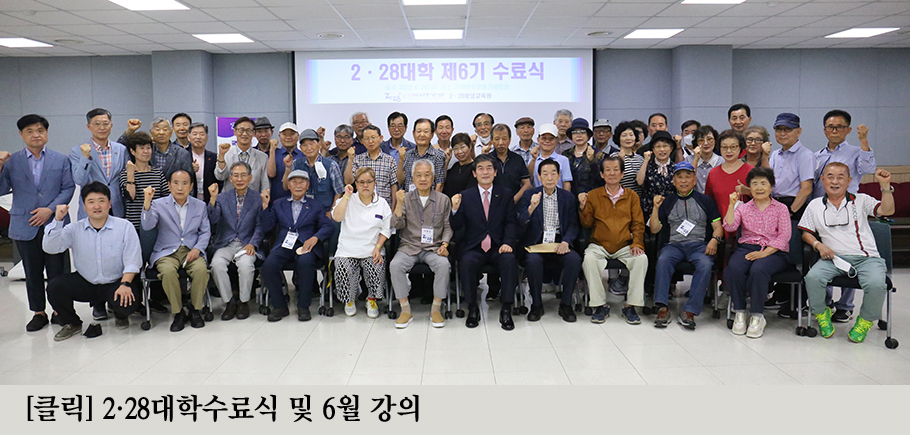 제6기 2·28대학 수료식이 6월 29일 오전 2·28민주운동기념회관 2층 대강의실에서 개최되었다. 이날 수료식에는 박영석 2·28기념사업회 회장을 비롯한 임직원과 수강생 등 60여 명이 참석했다. 박영석 회장은 축사에서 “배우는 즐거움을 누리는 인생이 행복한 인생”이라며 46명의 2·28대학 수료생들에게 축하의 메시지를 전했다. 2·28대학은 6월에 10차 시-12차 시의 세 차례 강의를 하고 6기 과정을 마쳤다. 6월의 강의는 손준혁 영남대 의대 교수(10차시)의 ‘노년기의 눈 관리’와 최재목 영남대 철학과 교수(11차시)의 ‘아버지는 누구인가’, 방경곤 전 대구시교육청 교육국장(12차시)의 ‘격대교육:손주를 돌보는 조부모 이야기’가 진행되었다.